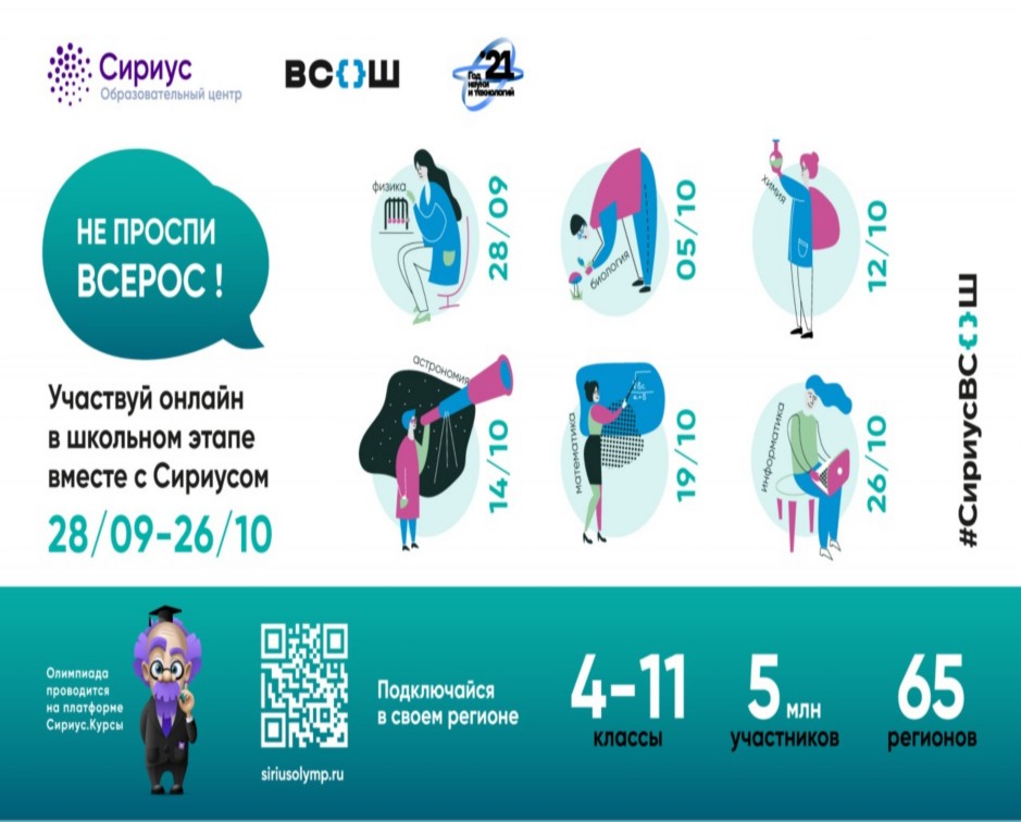 По школьной традиции каждый год с сентября (с 28.09 по 29.10)стартует школьный этап Всероссийской олимпиады школьников. Но в этом году он будет особенным... Олимпиада по шести образовательным дисциплинам (физика, биология, химия, астрономия, математика и информатика), приоритетным для Стратегии научно-технологогического развития страны, пройдет с использованием информационного ресурса "Сириус" в информационно-телекомуникационной сети Интернет.