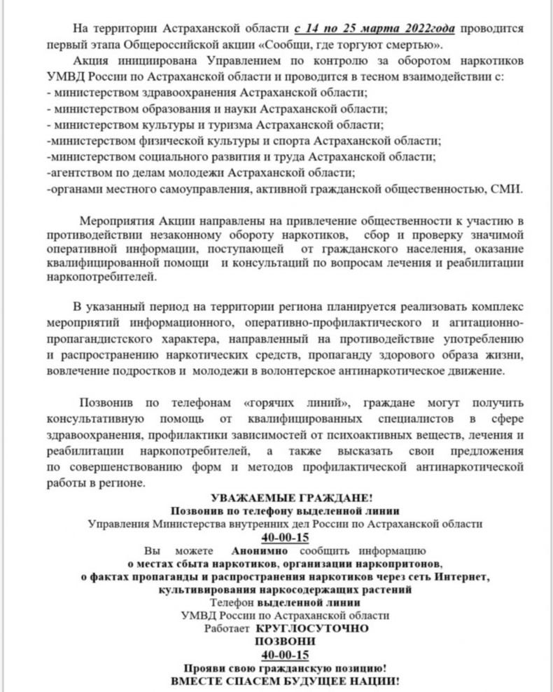 В связи с проведением в период с 15 по 26 марта 2021 года на территории Астраханской области Всероссийской антинаркотической акции «Сообщи, где торгуют смертью», районная антинаркотическая комиссия по противодействию злоупотреблению наркотическими средствами и их незаконному обороту совместно с ОМВД России по Харабалинскому району сообщает телефоны «горячей линии» для выявления фактов мест сбыта наркотиков, организации наркопритонов и мест культивирования наркосодержащих растений.